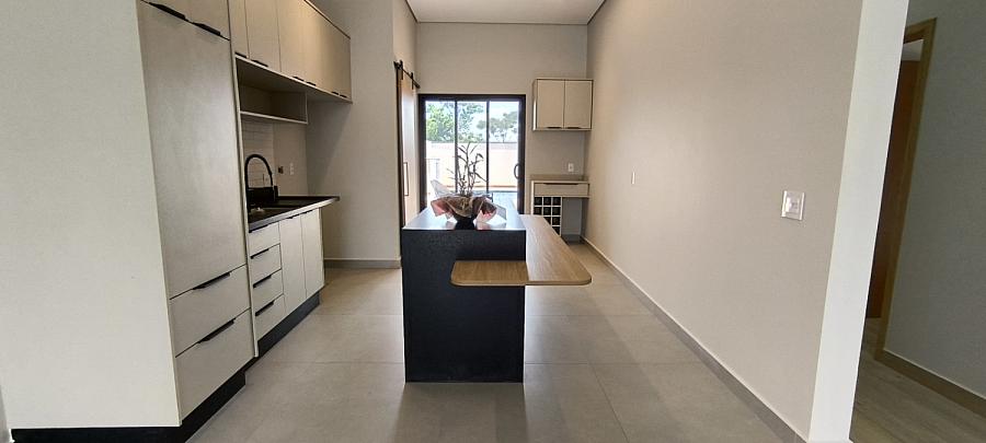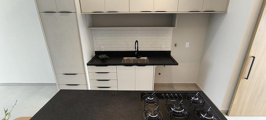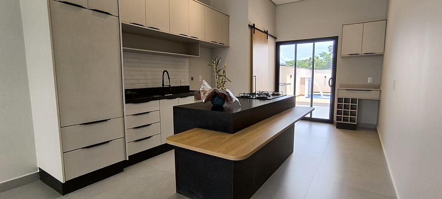 - Cozinha com ilha central e móveis planejados