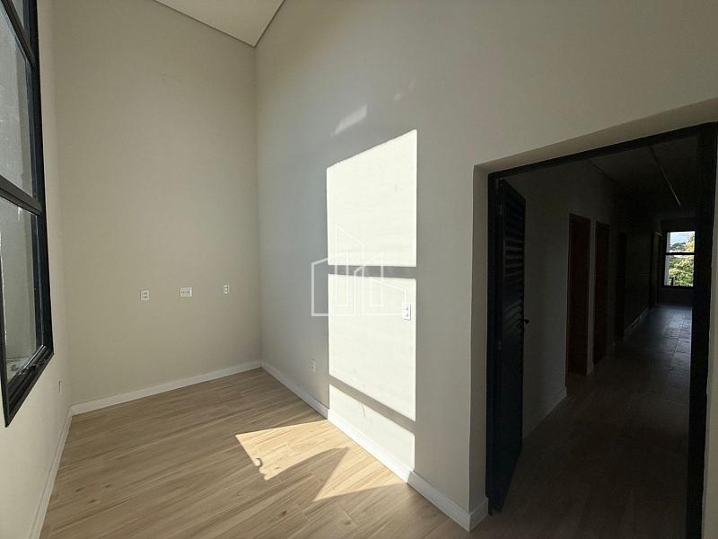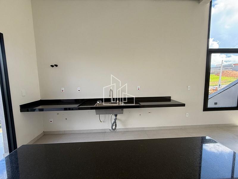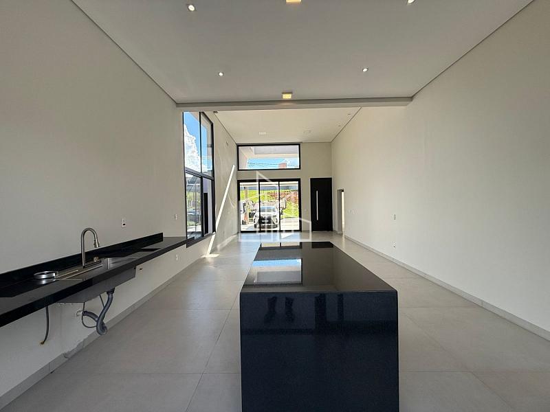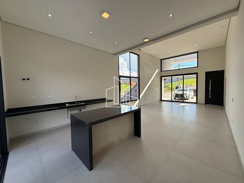 A casa conta com sala e cozinha integradas, com uma linda paisagem ao fundo