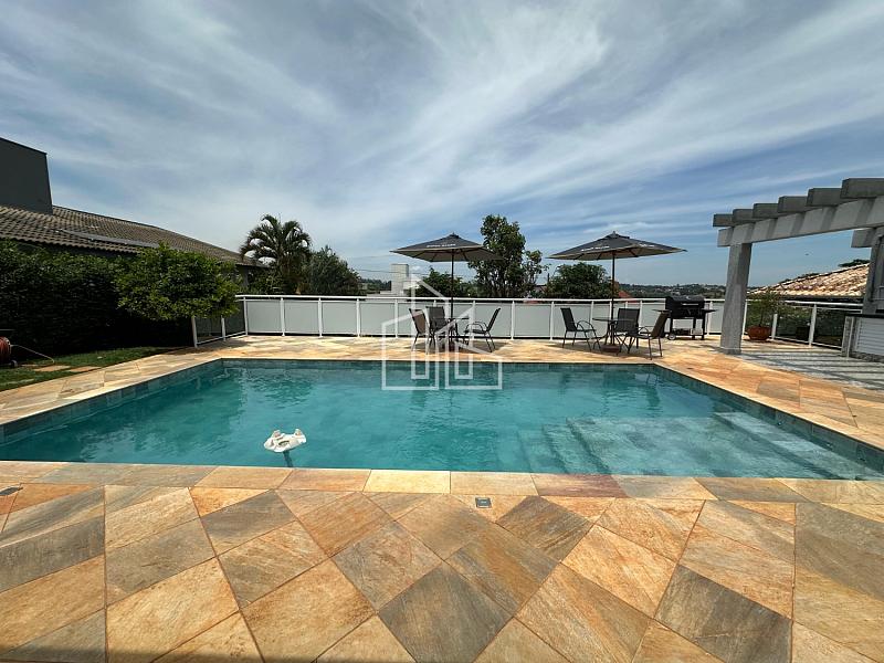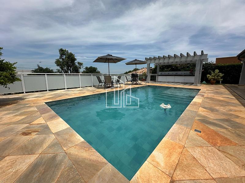 A piscina de 32m² possui aquecimento solar, sistema de iluminação de led e hidromassagem, casa de máquina com depósito, pergolado com área gourmet, deque e um banheiro externo.
