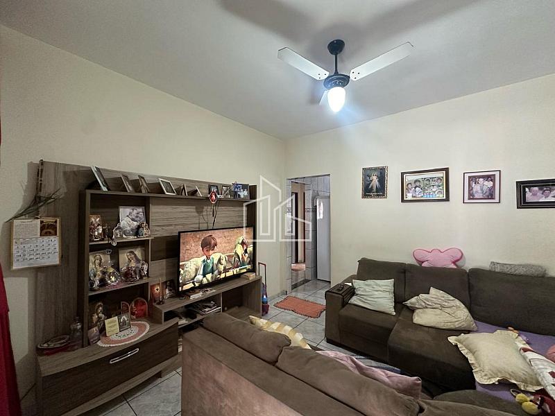 Casa principal com sala, banheiro social, 2 dormitórios, e uma ampla cozinha e lavanderia coberta.